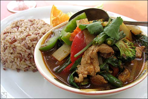 put in their guzzlers…so buhbye Patek Phillipe watch. ... upped my health index (to compensate for the petrol fumes.) This sort of curry is made without coconut milk and has a nice hint of heat against the herbaceous Thai basil. Crisp bell peppers, carrots, bamboo shoots, eggplant, mushrooms, zukes, broccoli, cilantro, green beans and onions were supplemented by slices of pork (you can choose chicken or tofu with this dish if you prefer.) It was a good meal, but not trip worthy. It’s a good place to keep in mind if you want a late lunch (they serve straight through to dinner) before braving the Whole Foods crowd or pawning your diamond encrusted grill to swap your gangsta smile for a Thai one.