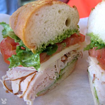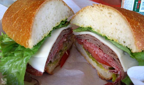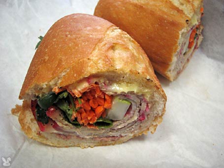 “the theme thing has officially crossed the line" (A meme) I am of course talking about eating out of toilets. I don't think that this theme restaurant is going to catch on like the ones that make you eat in the dark or raise your hand to go to the bathroom or get chained to the bar. I used to see flyers South of Market for Bondage-a-go-go advertising, "women chained to the bar before 7 drink free." I guess that makes up for earning a quarter less (for every dollar) an hour than men. Let's see, if you normally spend $20 a night on drinks, times 365 drinking days a year, working a 40 hour week, you are actually leaving the men in the dust by $6780 annually with this chained-to-the-bar-deal. Lucky. I was checking out Joy's site and saw that we were listed on her people/rabbits tagged on our first ever meme. Chubby is still hopping around saying, “Joy loves me, she really loves me.” Whatever. A meme is a unit of cultural transmission that replicates and mutates. In this particular meme, you take the fifth line of your 23rd blog posting and post it in your blog, tag 5 others to do the same and voila, you have made your me-me a you-you for those lucky five. I am tagging Dr. B at Meathenge cause he always has something meaty going on. In Praise of Sardines who also has praise for bunrabs, so we like him. David Leibowitz a former bay area pastry chef, now in Paris. Chez Pim who made fabulous chicken satay at the blogger bbq. The Amateur Gourmet who always has something fun to say. Lunch was dull looking, yet good sandwiches from Klein's deli. They name them after notable women (that I hope earned on par with their male counterparts.) The Ferraro ($6.50): ... is a sourdough roll filled with salami, roast beef, provolone and pepperocini. The McGinn ($6.25): ...is a sweet baguette