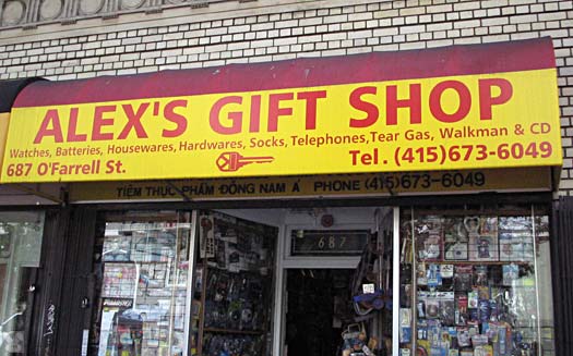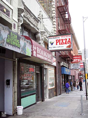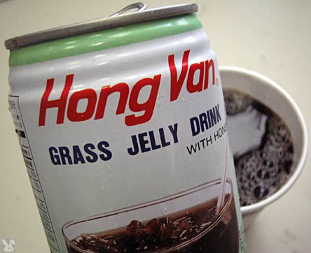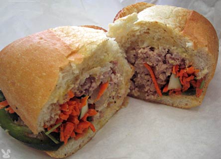 A day of fake outs: I thought that it was time that I checked out this Vietnamese “sandwich” shop on Larkin: I went in expecting the official greeting of the Banh Mi shop owners: “sandwiches?” Nothing. I walked towards the counter. Still nothing. I looked at the lady behind the counter and gave an unsure, “uh..sandwiches?” She replied, “No, no, sandwiches.” I took a look around and figured that they sold cartons of cigarettes as their cash cow. Down the street I went to Baguette Express for a Xiu Mai Banh Mi. (pork meatball sandwich $2.25.): Although good, the sauce on the pork was a little too sweet and slightly too mushy for me although the crunch of the shredded carrot, cucumber, jalapeno and freshness of the cilantro pepped it up. I prefer the pork meatball banh mi at Hoang Dat that I had earlier this week. I grabbed this can out of the cooler because it said, “ with meat.” A drink with meat? How cool is that? Well, upon closer examination, it didn't really contain any animal flesh, just logan's juice ($1.) I'd never had this before, it was slightly sweet tasting like a hybrid of iced tea and fruit juice, with big bits of logan sinking to the bottom. Dessert was Banh Chuoi ($1.25): ... which is what you would get if you imagined a slightly doughy, banana, tapioca jello with a dense, coconut dipping sauce. Very tasty (if you are in that kind of a mood.) They get their desserts from Hung Phat (hey, I didn't name the place) on Jones Street. Baguette