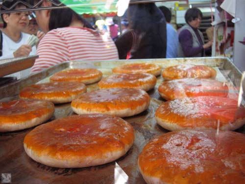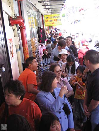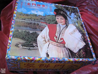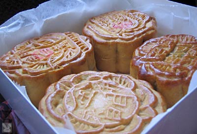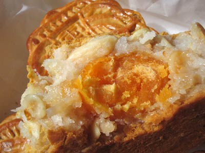 September 10, 2005 Most people are Chinese. I confirmed this today at the San Francisco Moon Festival: It’s like a mosh pit and Chinese Thanksgiving rolled into one, but instead of turkey the food of choice in the moon cake. Moon cakes are pastry encased, slightly sweet confections: I queued in the line at the Golden Gate Bakery for almost an hour. It was time well spent people watching. I finally made it the the front and ordered my assorted box of four.You get a choice of no yolk, one yolk or two yolk centers. I chose one yolk on each: I got a white lotus seed paste ($5.95) Plain lotus seed paste ($5.25), Black bean paste ($$4.50) and a Coconut ($5.95). They were all good but I liked the White lotus and the coconut ones the best. The yolk inside is bright orange. salty and slightly crumbly: If you aren’t expecting it, you may freak out when you get to the center of these heavy pastries. You might think that this sounds a little pricey for the bakery famous for it’s 95¢ egg custard tarts (yum) but when you consider the preparation that goes into these, it makes sense. The coconut one is filled with blanched almonds, macadamias and shreds of coconut with the yolk carefully placed dead center. The ornate pastry design molded on the top and the fluted baking forms make these pretty specialized. And they use their special holiday box (instead of the usual pink generic one.) ![]() I wouldn’t have invested this much time to get these if it weren’t for the celebration of the Autumnal Equinox. You know, it’s like how you wouldn’t jam tangerines in your socks except on Christmas. Golden Gate Bakery