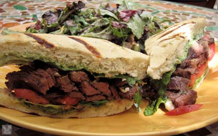 skirt steak, sliced and sandwiched with lettuce and slices of