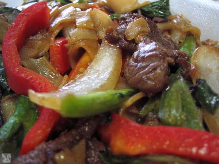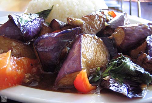 These pretty purple Chinese eggplants were sautéed with bean sauce, red bell peppers and basil. This Pad Ma-kuer ($6.25): ...was good but needed a splash of hot chili sauce (which sits among the condiments on the table) to round it out. This long, shiny, dark vegetable is a far cry from it's off white ancestor that actually looks like an egg (hence the name.) I like non plant eggs alot too. Whenever I separate egg whites I take out that little twisted cord that anchors the yolk to the center of the egg. It's called a chalazae. It reminds me of those things that fall out of the sky during that babydoll dancing scene in Eraserhead. I guess that's why I don't gobble them down… Thai