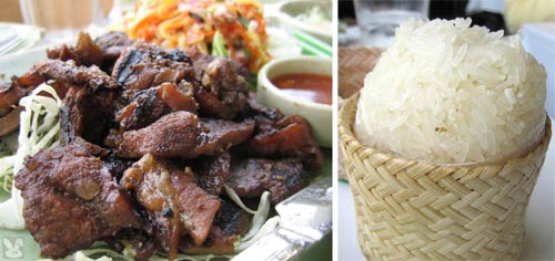 The guy that hangs out in front of this tree: told me that it fell over during a storm and the lady that owns the incense store down the street did this carving after fending off the City's tree removal thugs. It's too hippy for me, but I like the idea of it. I prefer the name of this restaurant to yesterday's although I'm not sure what the monkey reference is about (not that it needs to be about anything I guess…) When you name your restaurant something unusual, you are then sentenced to an eternity of parroting the same answer to the same question, over and over and over. It's better to name your restaurant “Chicken and Waffles” or “Meaty burgers” than “Thai Stick 4.0” Grilled Pork with Mango Salad and Sticky Rice ($10.95.): Flavorful slices of tender piggy rested on their cushion of shredded cabbage. The mango salad and sweet/sour dipping sauce made for a nice counterpoint and the steamy sticky rice did it's job of soaking up all the juices. This dish could have used a bit of a caliente kick. Maybe I'll ask them to turn up the heat next time. Koh Samui