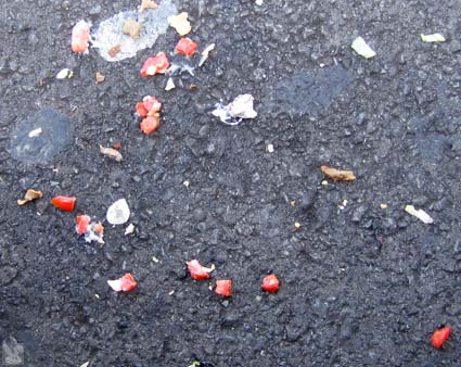 ...looked so promising. Tasty Carne Asada with crema, good quality guac, onions, cilantro, tomatoes, how could it be anything but sublime? Sadly, the bread on which they built this meat house was unsound. The somewhat over-the-hill roll's structure came unbolted to the foundation resulting in a messy sidewalk: