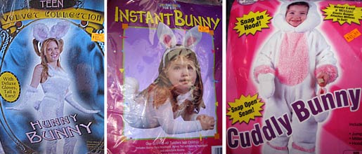 Halloween has officially arrived. Cyclone fenced pumpkin patches line the freeways and the perennial holiday stores have opened: They are like a Kmart hit squad. Cheap, Targeted and gone in an instant. Who decides on these mass produced, impulse purchase items? Obviously everyone wants to be a rabbit: ... but there are those who use their day of amnesty from good taste to dress as a toilet, baby or make some ham-handed innuendo: