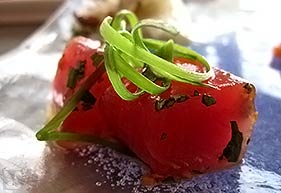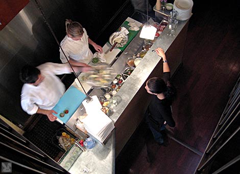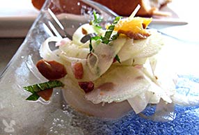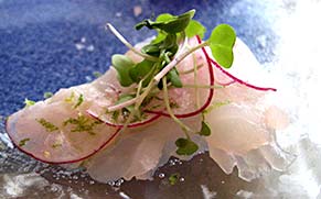 Crudo for two ($19.00) was a striking presentation of four sashimi assemblies. Crème fraiche boosted the richness of the char which was focused by the wasabi tobiko, and dill. Delicate slices of bass were arranged with paper thin radish coins and faintly peppery daikon sprouts. Marshmallow sized, red, tuna chunks were strewn with green onion ribbons. Of the quartet, this was the least dynamic. My favorite was the sweet tasting raw scallop halved and hidden under thin slices of fennel, chopped olives, mint and chunks of orange. | |||||||||||||||||||||||||||||||||||||||||