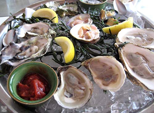 Assorted shellfish ($1.50 - $2.25 each) were served with sliced lemon, as well as mignonette and cocktail sauces. This order includes oysters, little neck clams and marinated mussels. This seasonal display included hits and misses but the marinated mussels and fresh clams were the tastiest of this day's platter. |