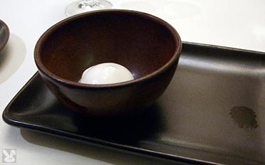 We were instructed to dab a bit of the plated cologne on our wrist before filling our pie holes with citrus to properly experience this interplay of aromatic and tongueomatic elements. Pristinely sectioned, pink, peppered, grapefruit was scented with tarragon and ginger in this sensicaloric course. Girly? Yes. Maybe they can add a macho option in which you kill something and rub its entrails on your face before eating your grapefruit. |