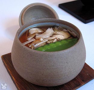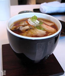 The chawan mushi were served two ways – one with crab, the other with halibut and enoki. Rather than being 100% custard, the solid component began about an inch under the soup layer. Both were tasty. |