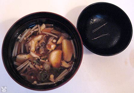 To calm us back down after our shark-like feeding frenzy, we were presented with bowls of soothing miso with mushrooms and scallions. |