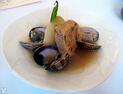 It was time to turn up the heat with a white bean curd sauce with boiled daikon, carrot, clams and snow peas. This was a homey preparation that came after pristine slices of fish (not an easy act to follow.) Although good, it was difficult for me to switch gears to fully enjoy this nicely made dish. |