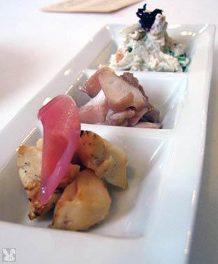 A trio of tastes included: tako cooked until tender, mirugai and a cold miso salad. |