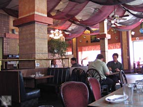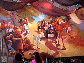 | Service: Order at the counter and indicate your table number (easily readable on their little stands.) If you don't know what you want to eat, take a menu to a table and peruse, go to the counter and order and grab a cup of self serve chai on the way back to your table. The people who work here are super nice. It's not like your normal eat-it-and-beat-it place where they are just trying to turn your table and have that don't-let-the-tandoori-hit-you-on-your-way-out attitude. They are really on the ball here. Atmosphere: Do you like camel murals? Do you like fabric draped overhead? If so, you have come to the right place. This ultra casual place doesn't not come up short on personality. |