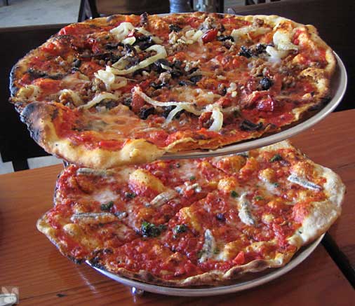 (top - $12.50): A thin, crisp, crust is brushed with tomato sauce and bits of sausage, tomatoes, onions, shrooms, cheese and parsley dot the top. It needed an extra kick from the pot of red pepper flakes. It may look big, but one pizza is about right for one rabbit. Boquerones “low tide” (bottom - $12.50): The beached anchovies were delicious along with the cheese and herbs that washed up in the tomato sauce. I greedily wished that there were even more of those dead fish dotted on the top for their bursts of flavor on an otherwise more subtly flavored terrain. |