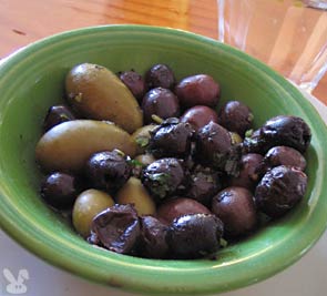 Goodies: The iced tea is fresh tasting and delish. The warm bowl of olives is a yummy surprise starter. The heated olives’ texture is softer and the flavors more intense than their cold counterparts. |