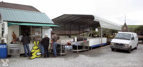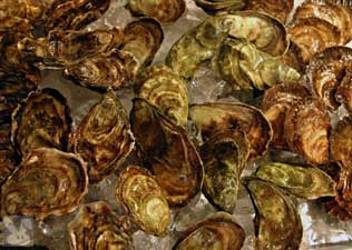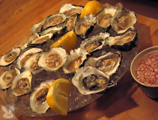 I got small Sweetwaters, Atlantics (known elsewhere as Bluepoints) and Europeans (same species as the Belon’s in France). They were all fabulous. Buying at the source saved money over going to a restaurant, I spent $40 for my assortment of 3 dozen. I could have spent less, but those “Europeans” were the priciest in the place. Even though the names (“Atlantics”, “Europeans”) make it sound like these oysters are shipped in from all over the place, they are all really grown fresh right there in Tomales Bay, several yards from where I bought them. The sweetwaters were firm and fleshy. The Atlantics were briney and had a wonderful plumpness to them, the Europeans were lean and flirted with a clam-like mouth feel. I made a simple mignonette sauce and everything was alright. A great way to see the coast and have a fun trip. If you can’t pry yourself away from the city, Hog Island’s restaurant in the Ferry Building has a “happy hour” Monday and Thursday from 4:30 to 7 p.m. during which they sell their sweetwaters real cheap (a buck each) and beer is $2.50 a pint. |