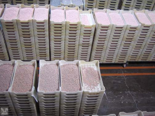 Making these little sugar balls is pretty involved, they are molded in cornstarch, cooled, showered in sugar, coated and silk screened with a logo. This process takes days because they have to "cure" the candies. |