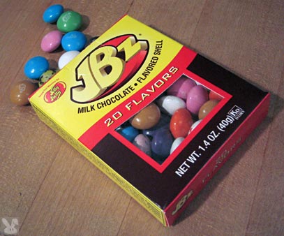 JBz (their take on M&M's) are the strangest tasting thing ever. They're bits of milk chocolate coated in a hard candy shell which is imbued with one of the Jelly Belly flavors, creating a kind of flavored chocolate morsel. I've never understood the whole "flavored" chocolate thing. Chocolate already has a flavor: it's called "chocolate." Not my thing either. |